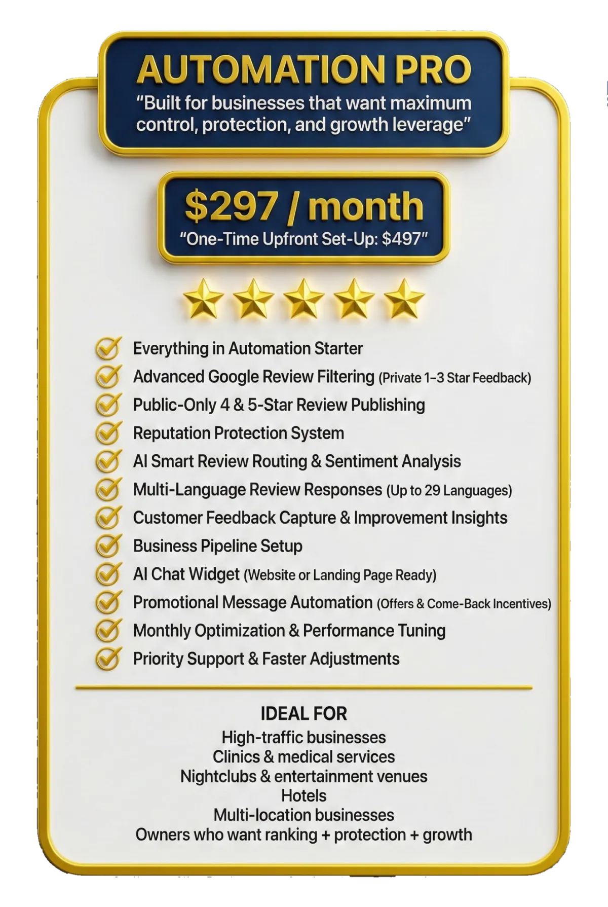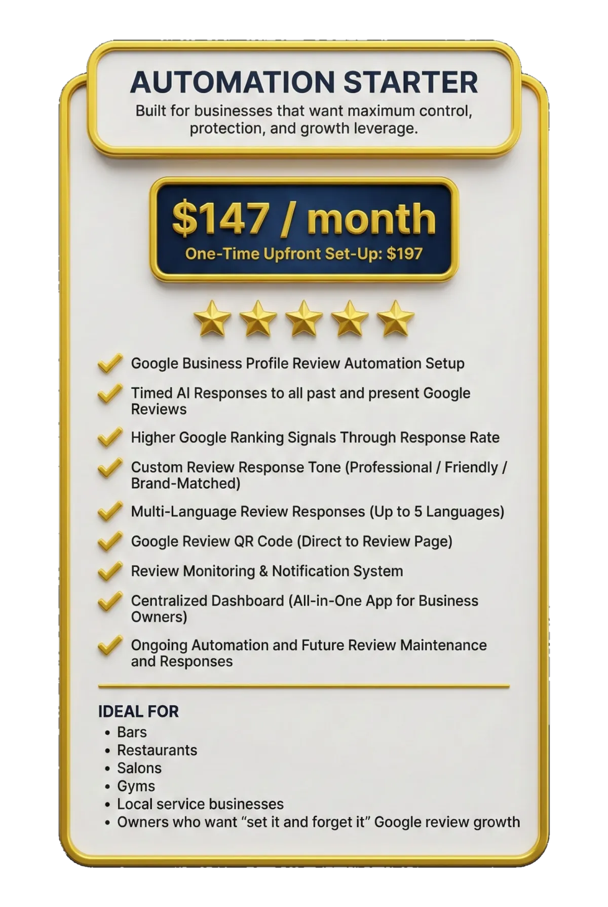 We protect your reputation, control engagement, and optimize Google ranking signals automatically without relying on you or your staff to remember anything.